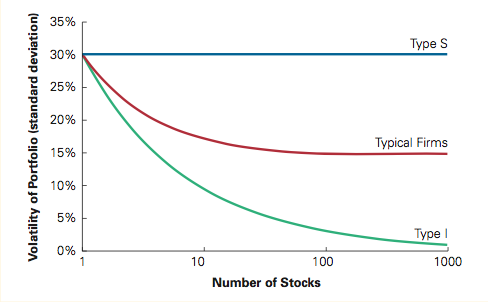 The portfolio of Type I firms (green curve) only face diversifiable risk, similar to theft insurance more risk is diversified as the portfolio size increases. When the number of stocks is large, we see that the risk for this portfolio is essentially eliminated.