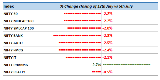 Nifty50 continued to slide last week (down 2.2%). Weakness was evident across capitalisation – midcap (down 2.2%) and smallcap (down 2.0%) following the broader market trend. Amongst sector indices, Bank, Auto, FMCG, IT each slid by over 2%. Only Pharma had a good run (up 2.7%)