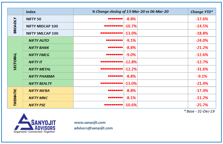 For the week, all benchmark, sectoral and thematic indices in deep red. NIFTY50 -8.8%, Midcap -10.7%, Smallcap -13.0%, Sectoral: REALTY -13.0%, IT -12.8%, PSE -10.6%
