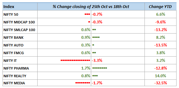 Happy Dhanteras to all. Nifty50 pulled back and lost 0.7% over last Friday’s closing. Midcap was down 0.3% but Smallcap gained 0.6%. Amongst sectoral indices, Pharma (+1.7%), Bank (+0.9%) gained, IT (-3.3%), Media (-1.7%) lost.