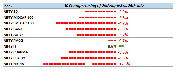 Nifty50 ended below the psychological 11,000 mark with a loss of 2.5% from last Friday’s closing. All sectoral indices, apart from IT were in red. Nifty Midcap (-2.8%) and Smallcap (-4.7%) continued to underperform Nifty50.