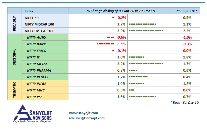 The trend continues in the first week of 2020. Nifty50 closed marginally (-0.2%) below last Friday’s closing. Midcap gained 1.7%% and Smallcap gained 3.5%. Amongst sectoral and thematic indices, Metal +3.2%, PSE +1.6% and Realty 1.2% made gains. Bank -1.1% and Auto -0.5% closed weaker.