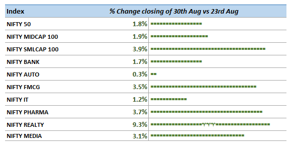 Nifty50 regained 11000 with a 1.8% jump during the week. Midcap (up 1.9%) and Smallcap (up 3.9%) outperformed Nifty. All major sectoral indices were positive led by Realty (+9.3%), Pharma (+3.7%), FMCG (+3.5%).