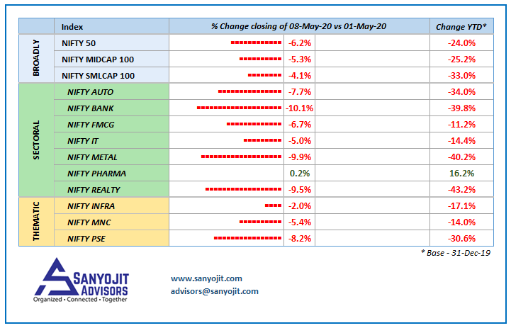Last week: NIFTY50 -6.2%, Midcap -5.3%, Smallcap -4.1%, Sectoral: PHARMA 0.2%, BANK -10.1%, METAL -9.9%