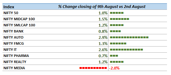 Nifty50 had a wonderful week with strong gains on Thursday and Friday, ending up 1% over last Friday’s closing. Positive movement in both Midcap (up 1.5%) and Smallcap (up 1.2%). Sectoral indices also performed well with Auto (up 2.9%), IT (up 2.6%), FMCG (up 1.3%) leading the gainers’ chart. Media ended in red (down 2%).